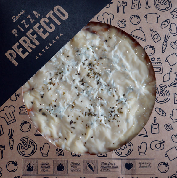 - Ingredientes: Harina de trigo,mozzarella(35%), edam (10%), queso azul (4%), gouda (2%),agua, tomate, aceite de oliva virgen alto oleico,aceite girasol, mantequilla, levadura, sal y orégano.