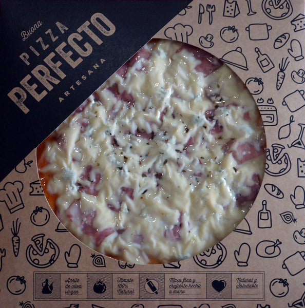 Pizza artesanal con la masa echa a mano, fina y crujiente, elaborada con ingredientes de gran calidad y aceite de oliva. Lleva una mezcla de nuestros quesos artesanos que le dan un sabor único.